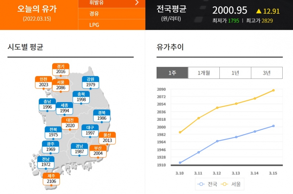 다른 시·도 휘발유 평균 판매가는 리터당 서울 2086원, 인천 2023원, 대전 2020원, 경기 2016원, 울산 2013원, 부산 2004원, 충북 1998원, 대구 1997원, 충남 1996원, 세종 1994원, 경남 1987원, 경북 1986원, 강원 1979원, 전북 1975원, 전남 1972원, 광주 1969원 등이다.