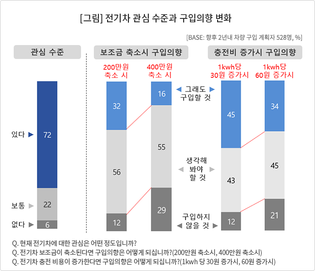 보조금이 200만원 줄어들 경우 '그래도 구입할 것'이라는 응답은 72%에서 32%로 떨어졌다. 12%는 '구입하지 않을 것'이라 말했고 절반이 넘는 56%는 '다시 생각해 봐야 할 것'이라고 답했다. 보조금이 400만원 감소하면 '구입하겠다'는 의향은 16%로 대폭 줄었다.