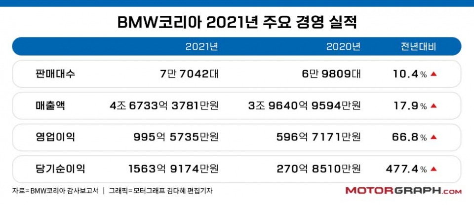 BMW코리아가 8일 공시한 감사보고서에 따르면, 2021년도 매출액은 전년대비 17.9% 증가한 4조6733억원을 기록했다. 이는 BMW코리아 설립 이후 최대 기록으로, 지난해 역대 최고 기록을 경신한 지 단 1년 만에 또다시 역대 최고 기록을 경신했다.