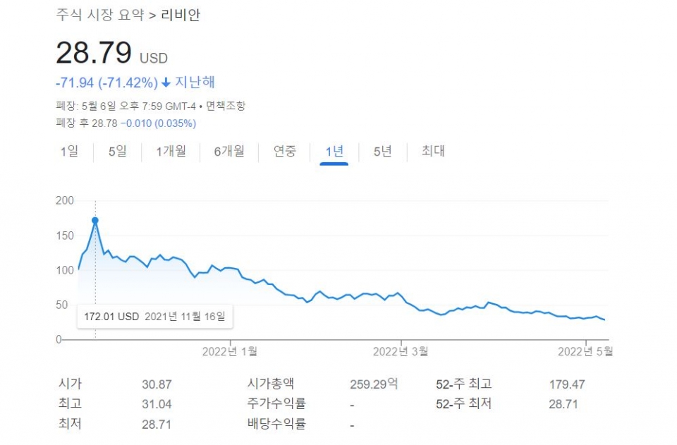 월가는 이번 조치가 리비안의 잇따른 주가 폭락 때문인 것으로 보고 있다. 리비안은 지난해 11월 뉴욕 증시에 상장 당일에만 30% 이상 폭등하며 성공적인 출발을 알렸지만, 올해 들어 주가가 지속적으로 곤두박질 치고 있다. 지난 6일 리비안 종가는 28.79달러로, 최고가(172.01달러) 대비 84%가량 빠졌다.