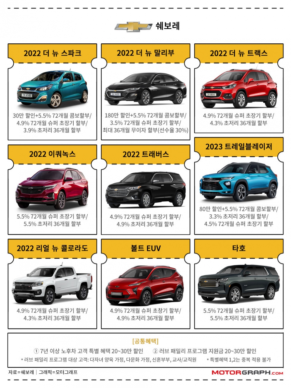 이외 7년 이상 노후 차량 보유 고객이 스파크 구매 시 20만원, 말리부·트랙스·트레일블레이저·콜로라도 구매 시 30만원을 추가로 지원한다. 단, 노후차 할인은 러브 패밀리 프로모션과 중복으로 적용되지 않는다.