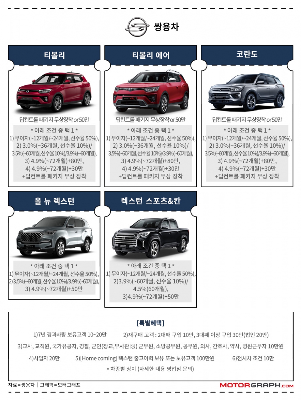 이외 7년 이상 노후 차량 보유 고객이 렉스턴 구매 시 20만원을, 코란도·티볼리(에어 포함)·렉스턴 스포츠(칸 포함) 구매 시 10만원을 지원하는 노후차 교체 지원 프로그램도 이어간다.