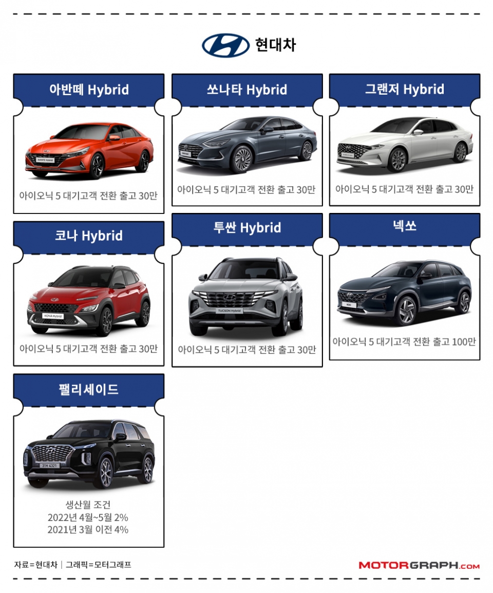 현대차는 지난달보다 혜택이 소폭 줄었다. 여전히 기본 할인은 진행하지 않는 가운데, 극히 제한적인 재고 할인과 연계 서비스 캐시백 이벤트만 마련됐다.